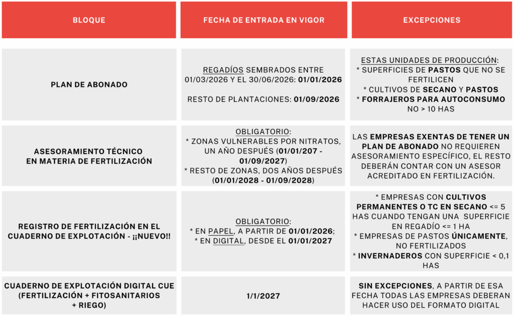 A partir de 2026, se exige un plan de abonado; desde 2027, se solicitará el CUE – Cuaderno de explotación digital; y en 2027 o 2028, será necesario asesoramiento técnico en materia de fertilización.