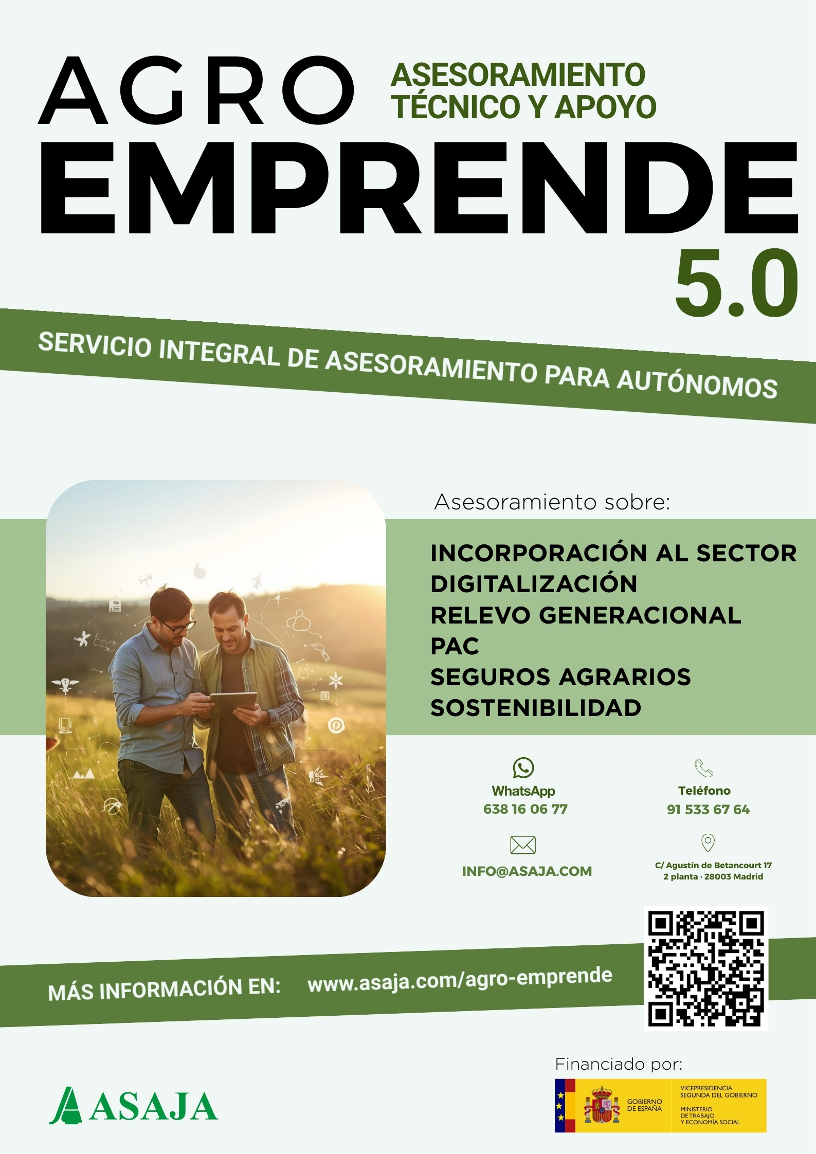 AgroEmprende 5.0 es la nueva edición del servicio técnico de asesoramiento y acompañamiento impulsado por ASAJA, dirigido a emprendedores del medio rural que desean iniciar, consolidar o modernizar su actividad en el sector agrario. Esta edición da continuidad al proyecto original, adaptándolo a los nuevos retos tecnológicos, económicos y ambientales del sector.