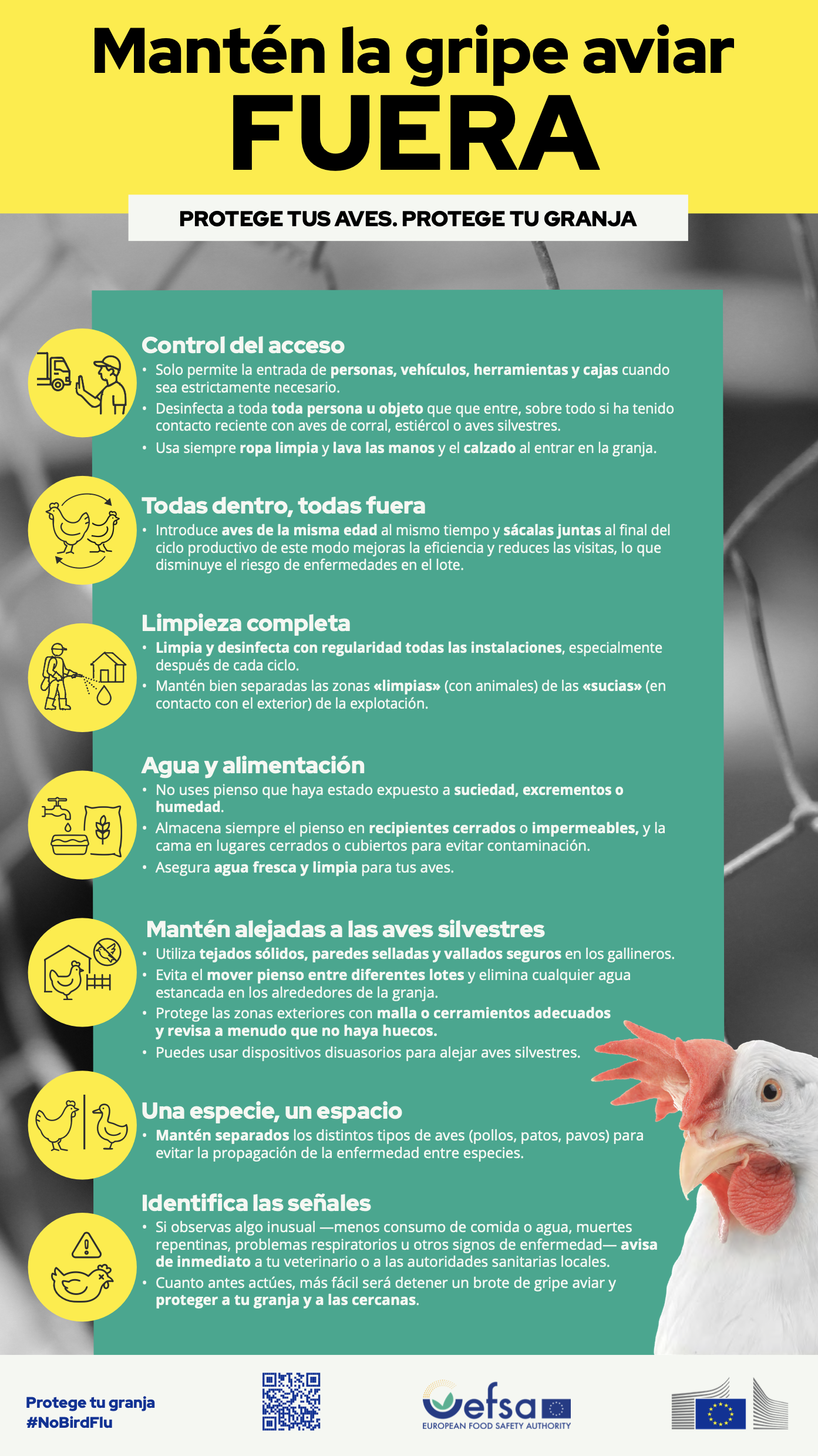 Con la campaña ‘Mantén la gripe aviar fuera. Protege tus aves. Protege tu granja’, el organismo busca reforzar la concienciación y evitar que el virus vuelva a causar estragos en el sector avícola durante los próximos meses.