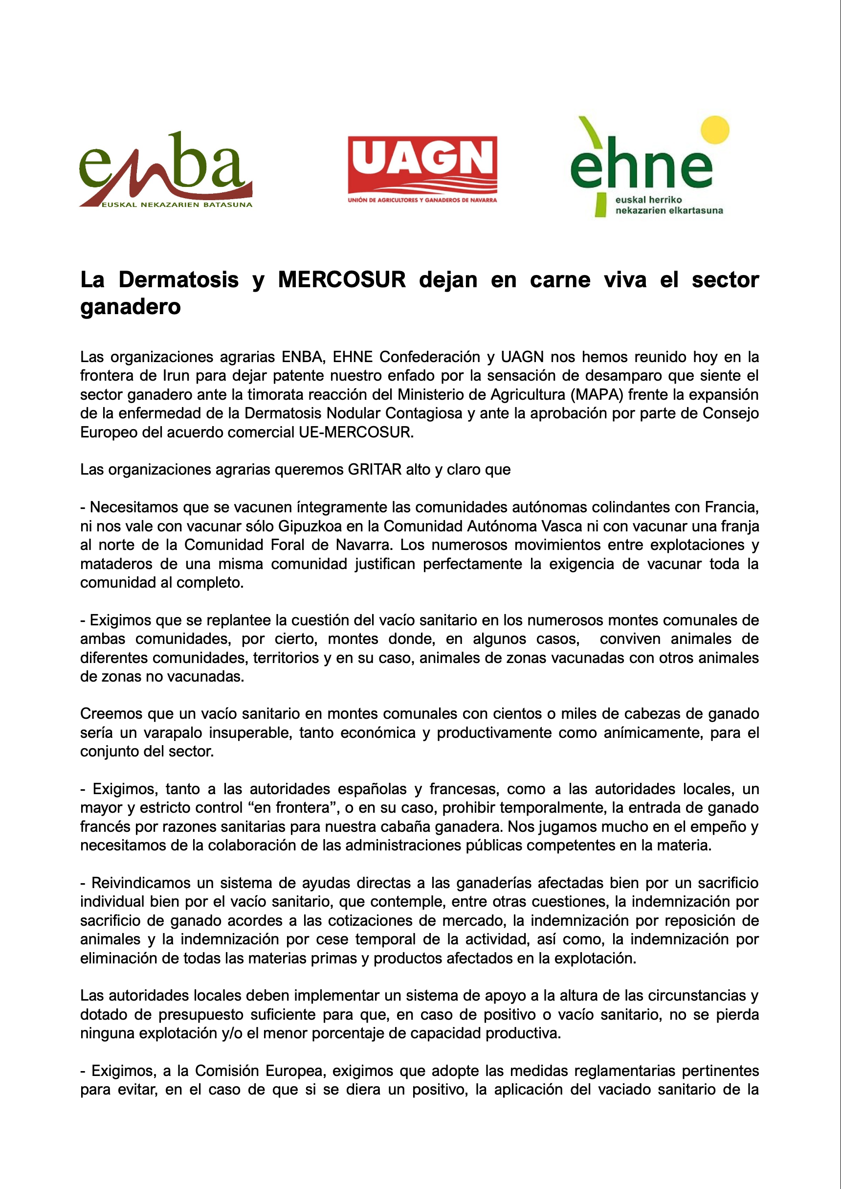 - UAGN, ENBA y EHNE Confederación: nota de prensa