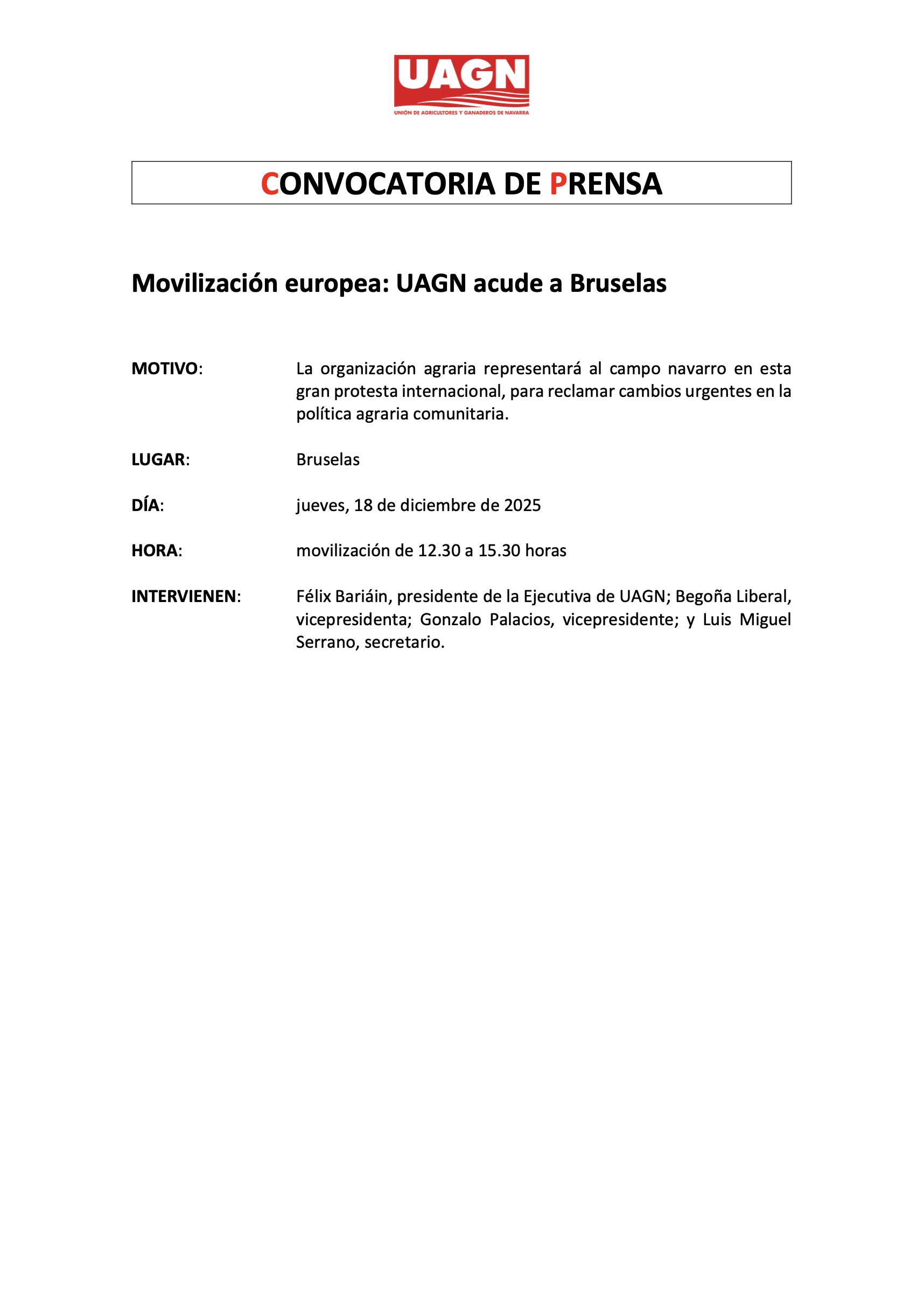 • Europa Press: ‘UAGN se suma este jueves a una manifestación en Bruselas para protestar por la situación del campo europeo’