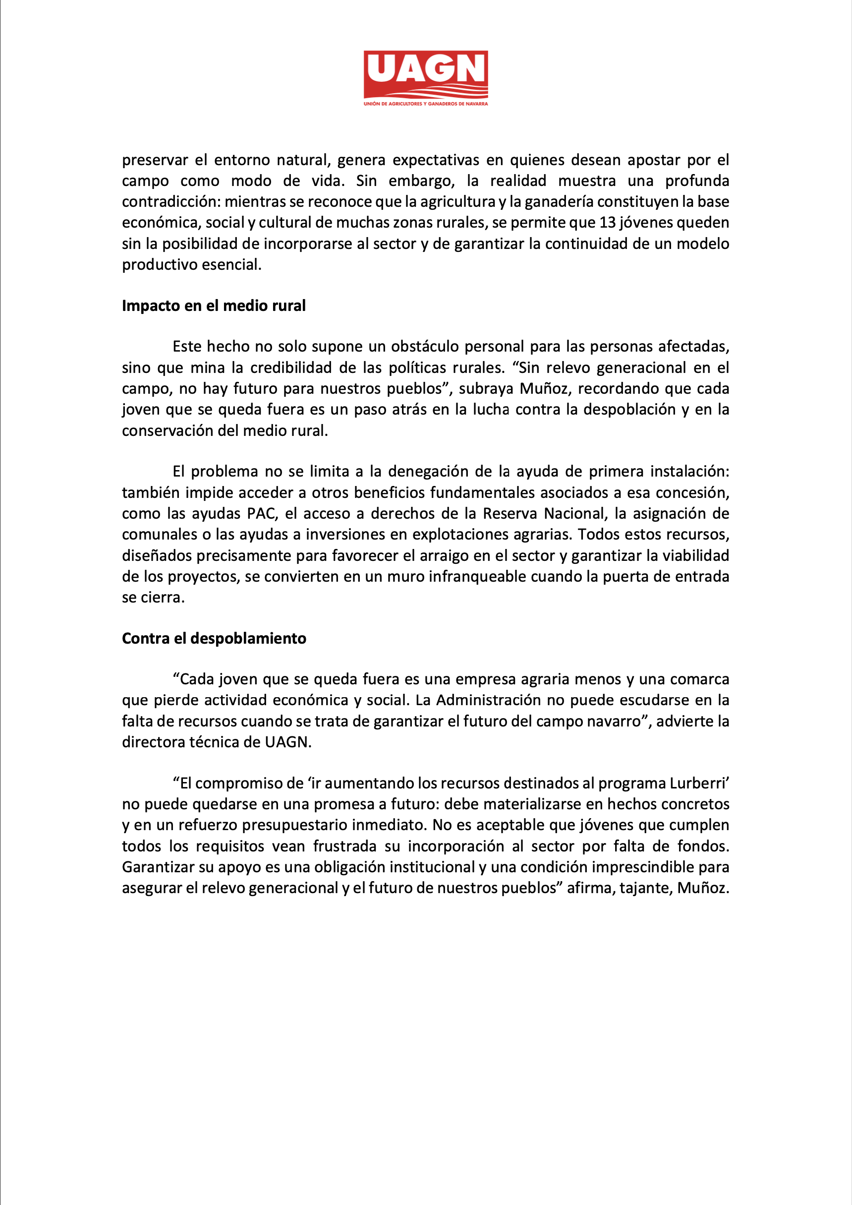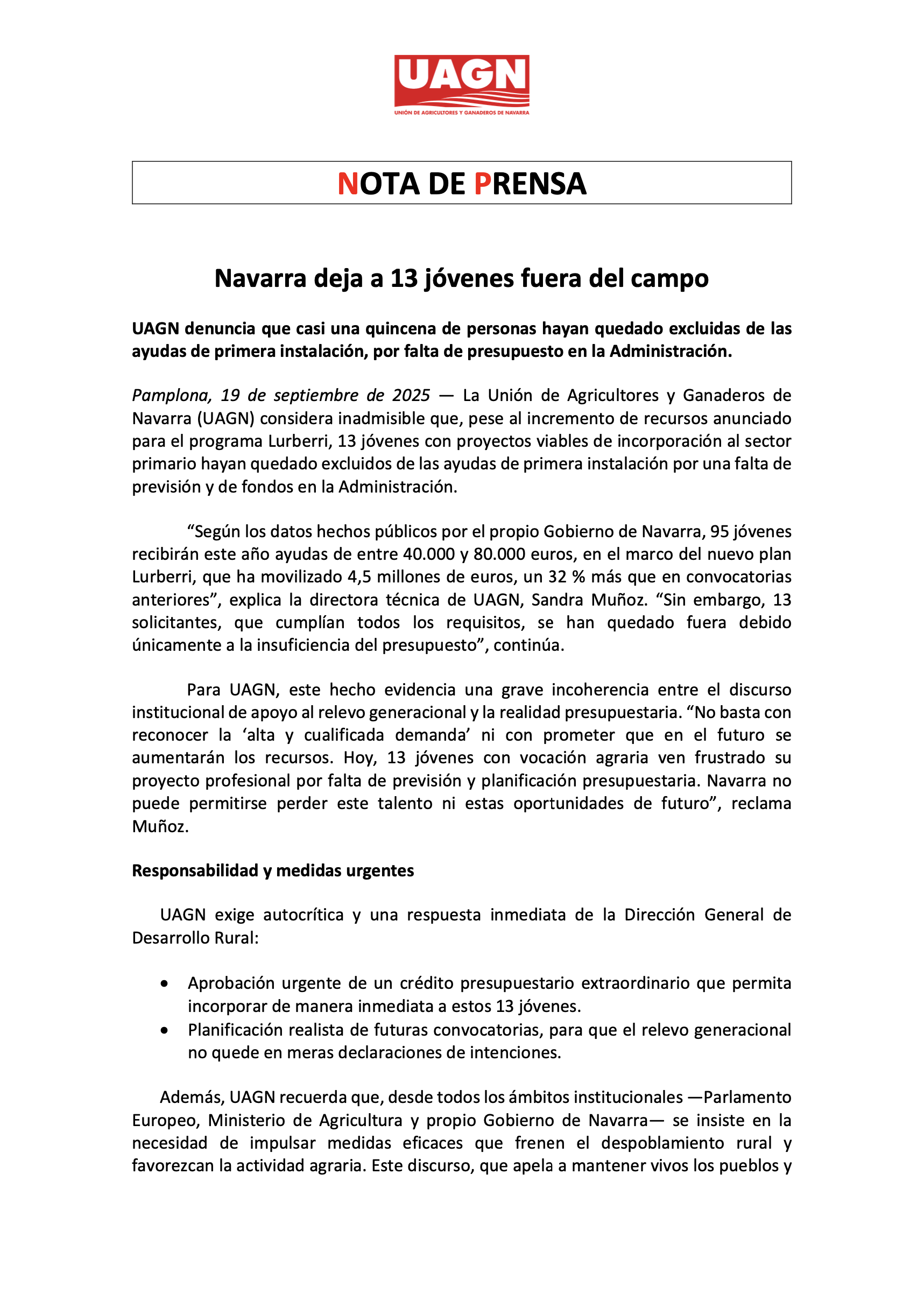 - Navarra Información: ‘UAGN denuncia que cerca de 15 jóvenes no han recibido ayudas de primera instalación’