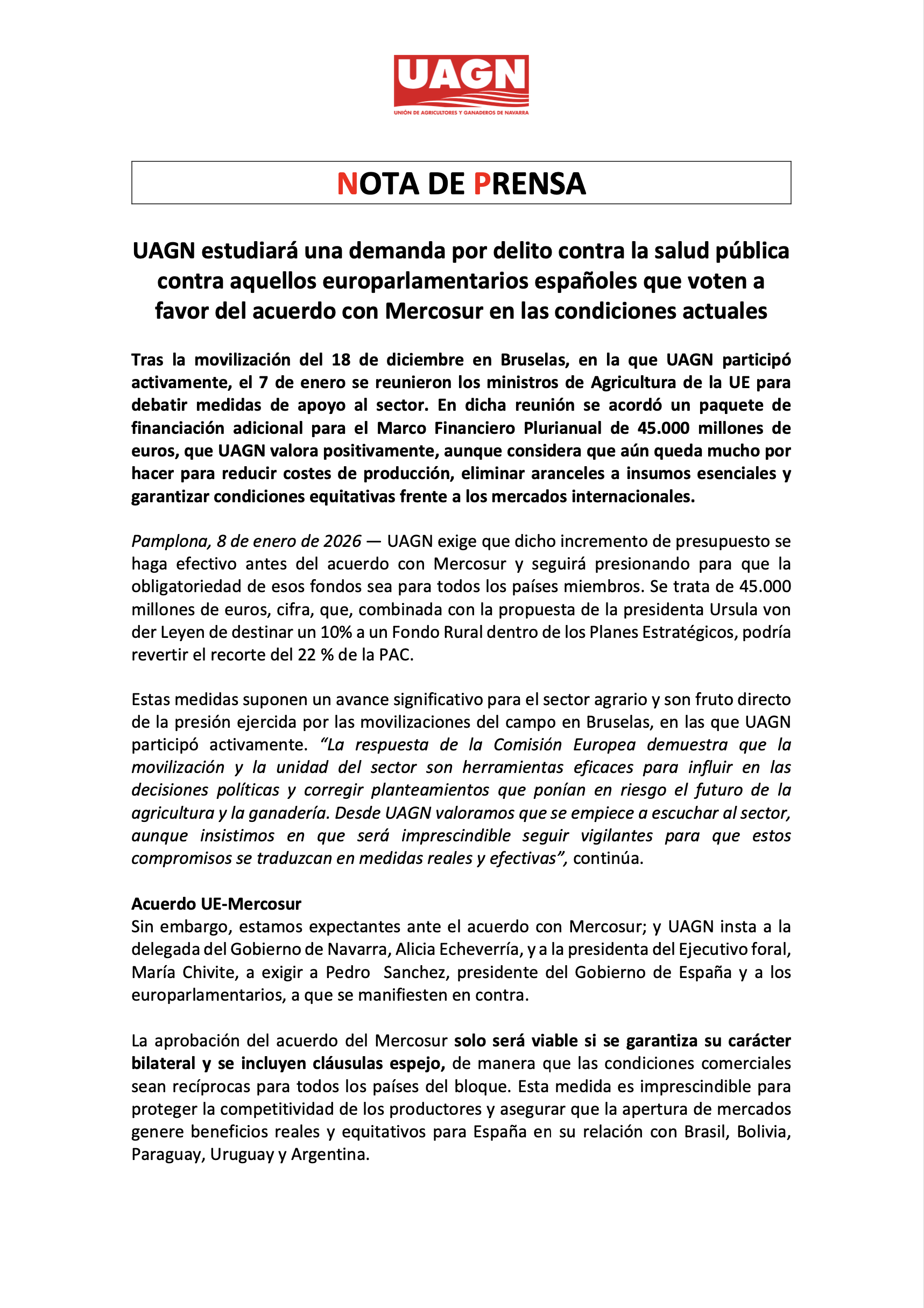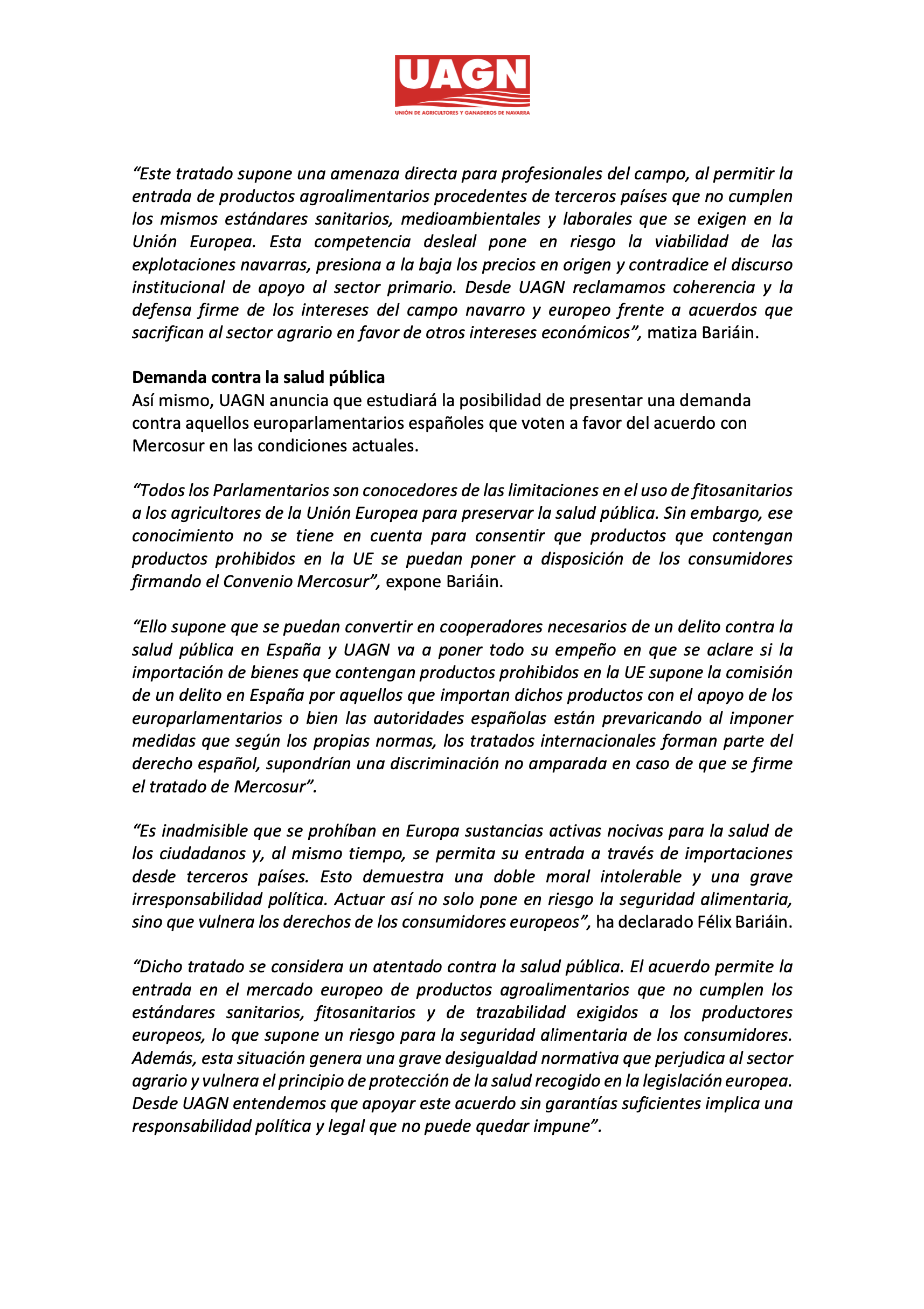 - UAGN: ‘UAGN estudiará una demanda por delito contra la salud pública contra aquellos europarlamentarios españoles que voten a favor del acuerdo con Mercosur en las condiciones actuales’