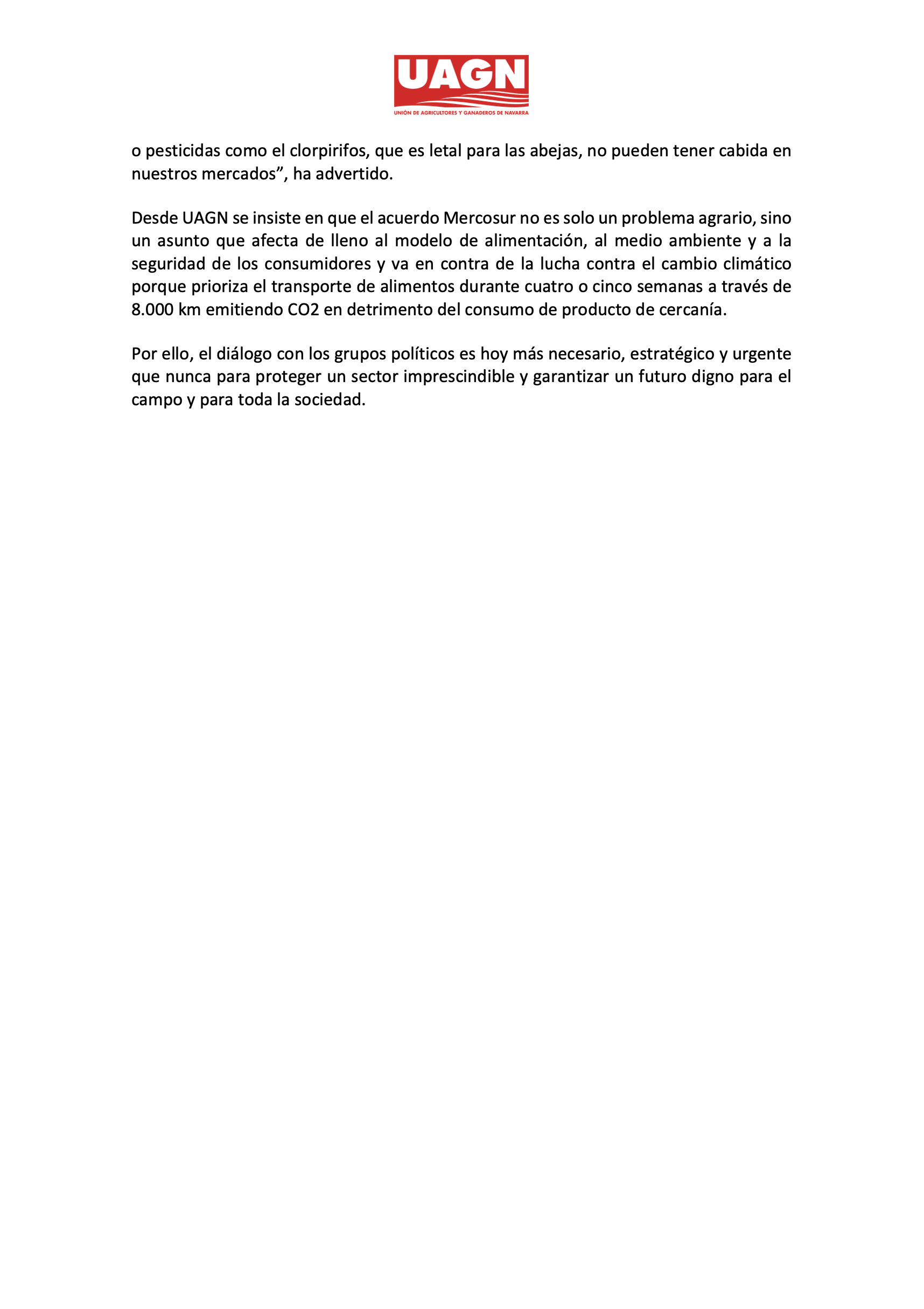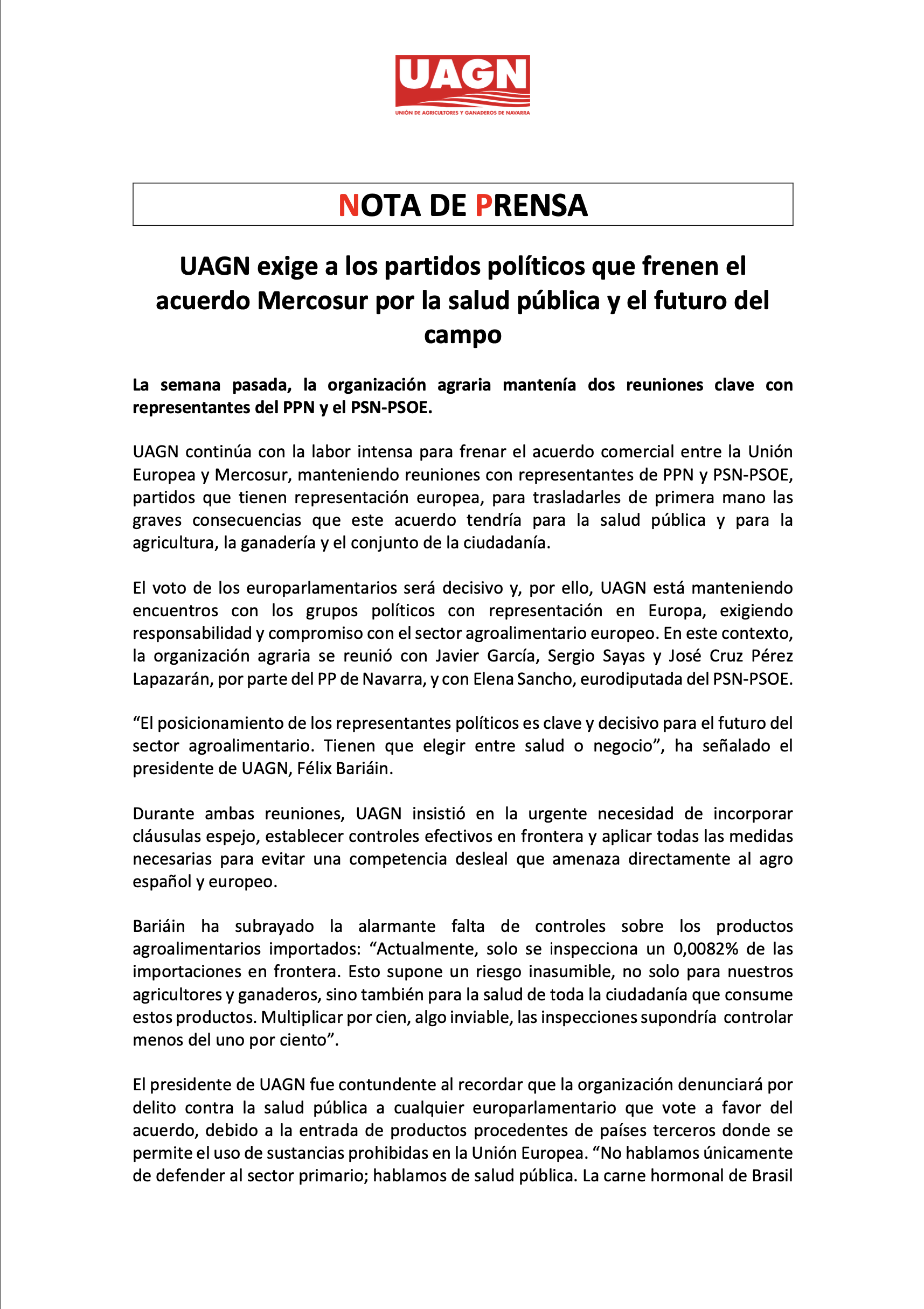 - Pamplona Actual: ‘UAGN exige a los partidos políticos navarros que frenen el acuerdo Mercosur por la salud pública y el futuro del campo’