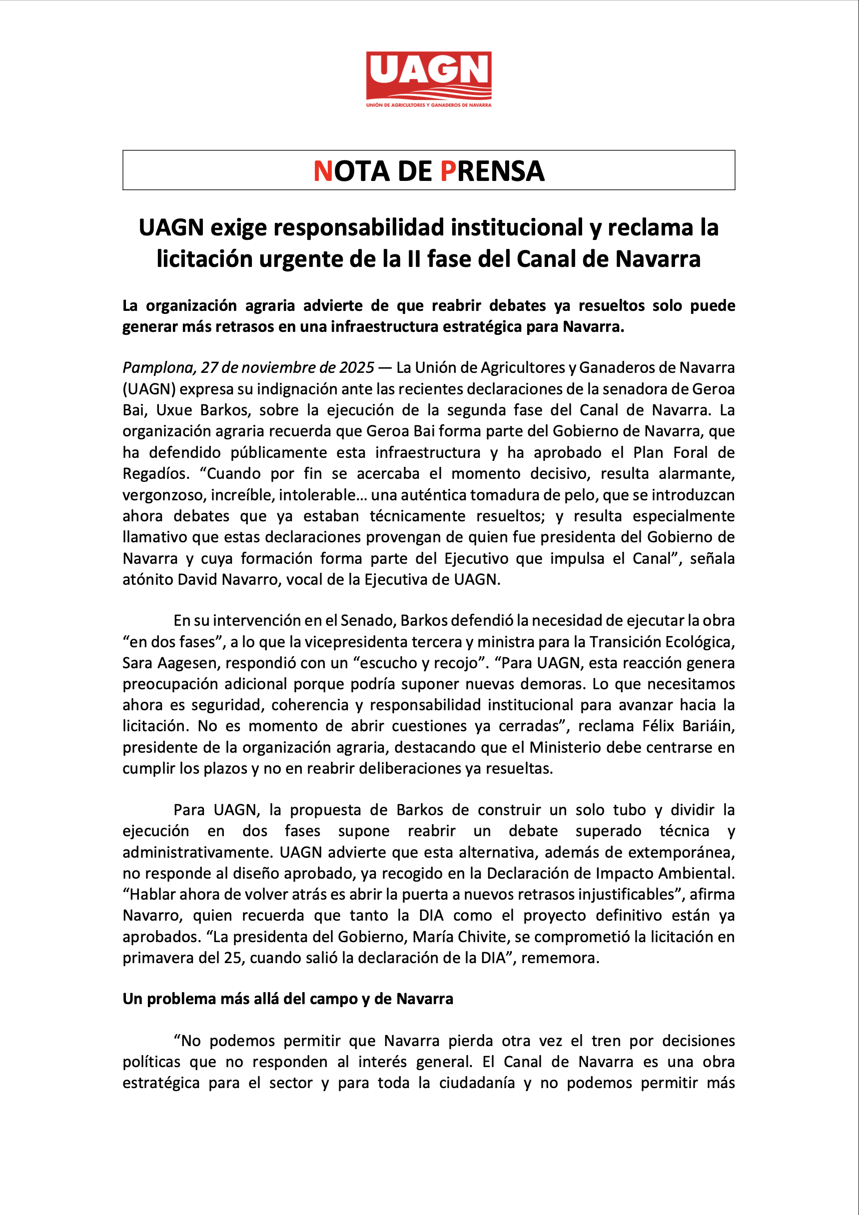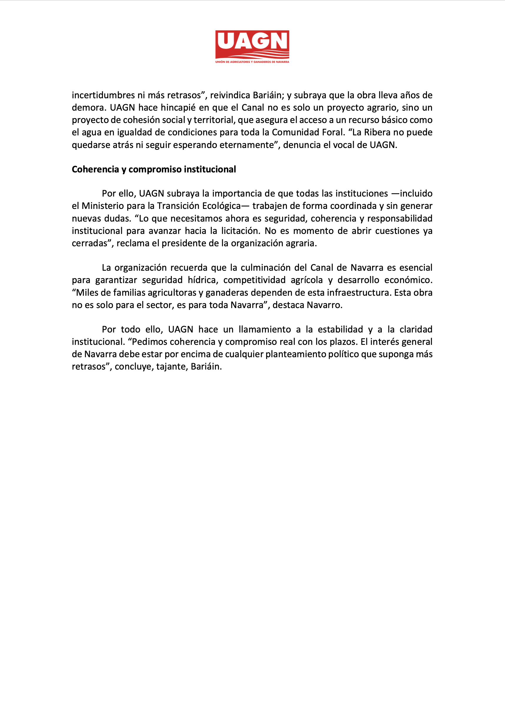 • UAGN: ‘UAGN exige responsabilidad institucional y reclama la licitación urgente de la II fase del Canal de Navarra’