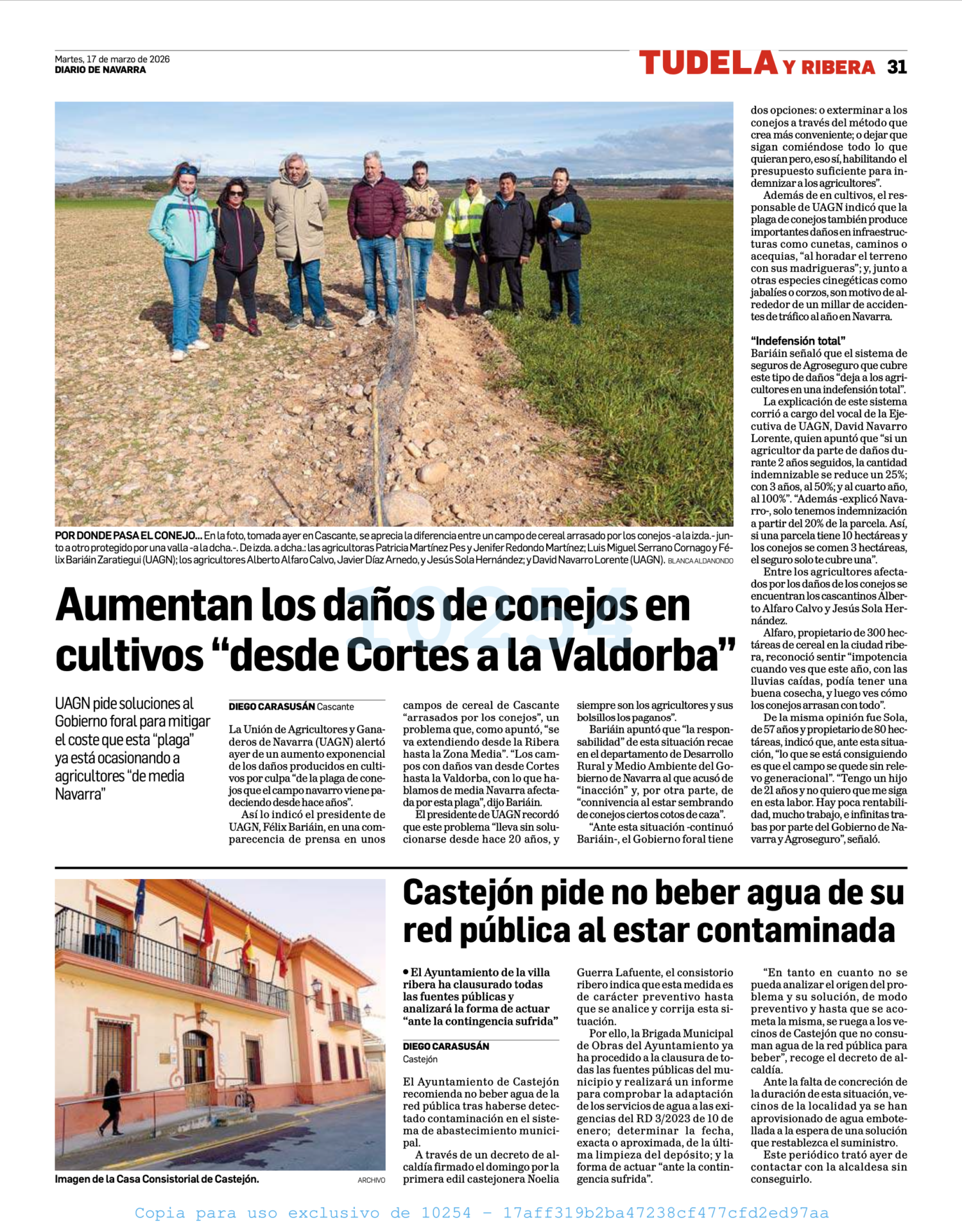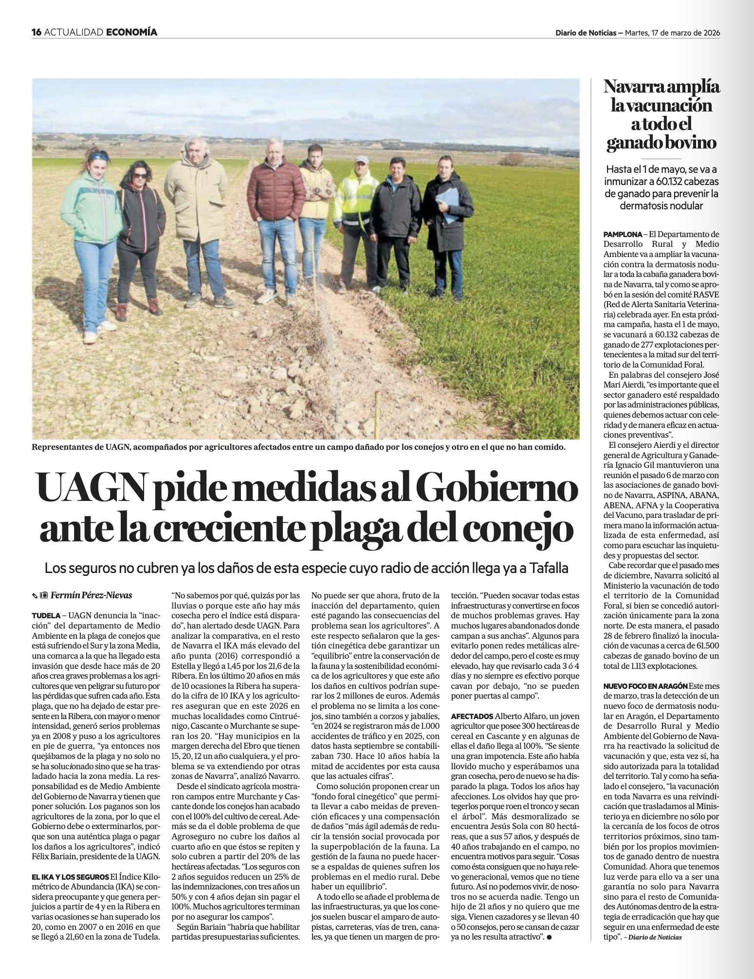 - Europa Press: ‘UAGN pide al Gobierno de Navarra medidas ante la plaga de conejos que "arrasa" cultivos y la "indefensión" del sector’