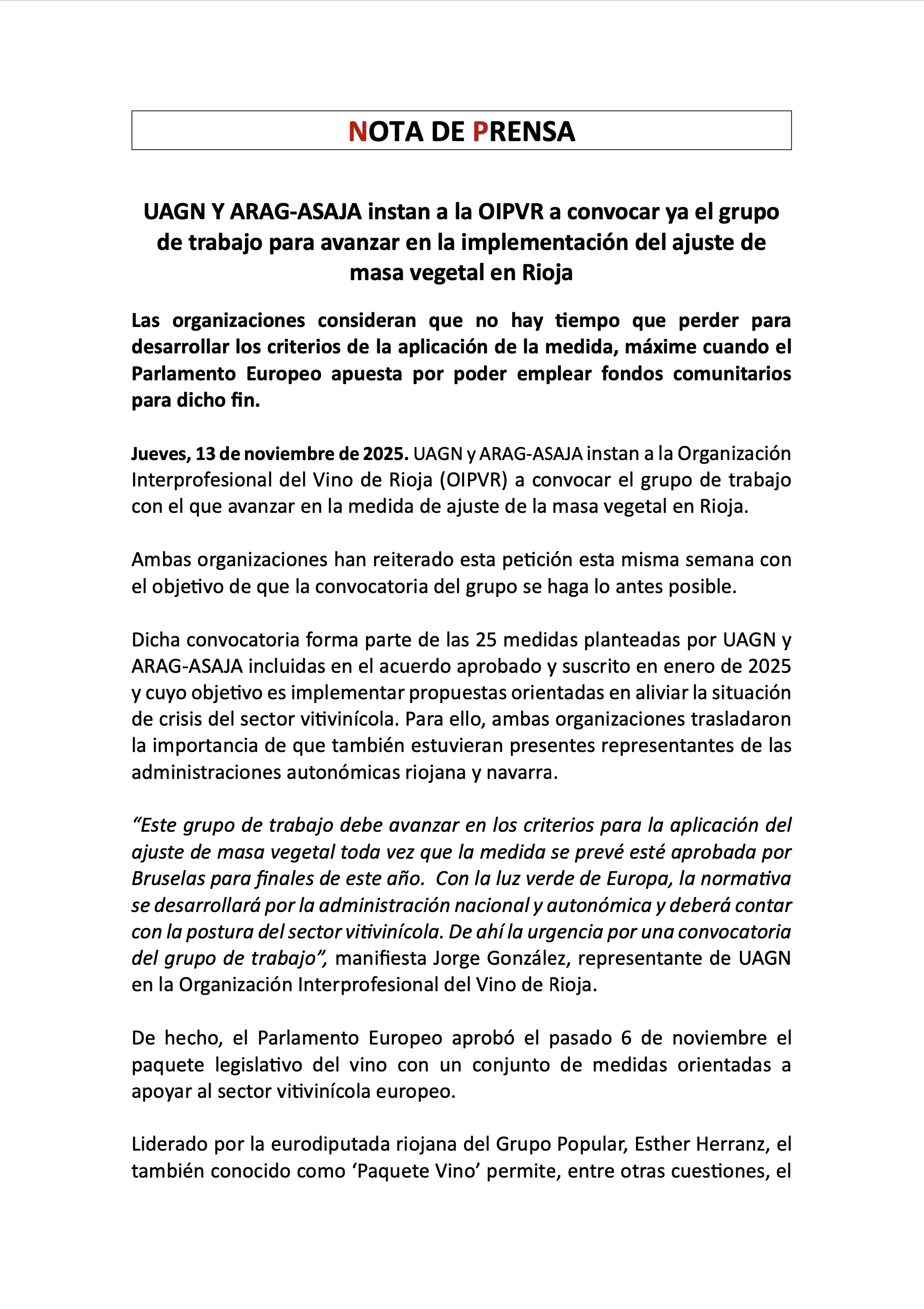 17/11/2025Noticia: UAGN Y ARAG-ASAJA instan a la OIPVR a convocar ya el grupo de trabajo para avanzar en la implementación del ajuste de masa vegetal en Rioja