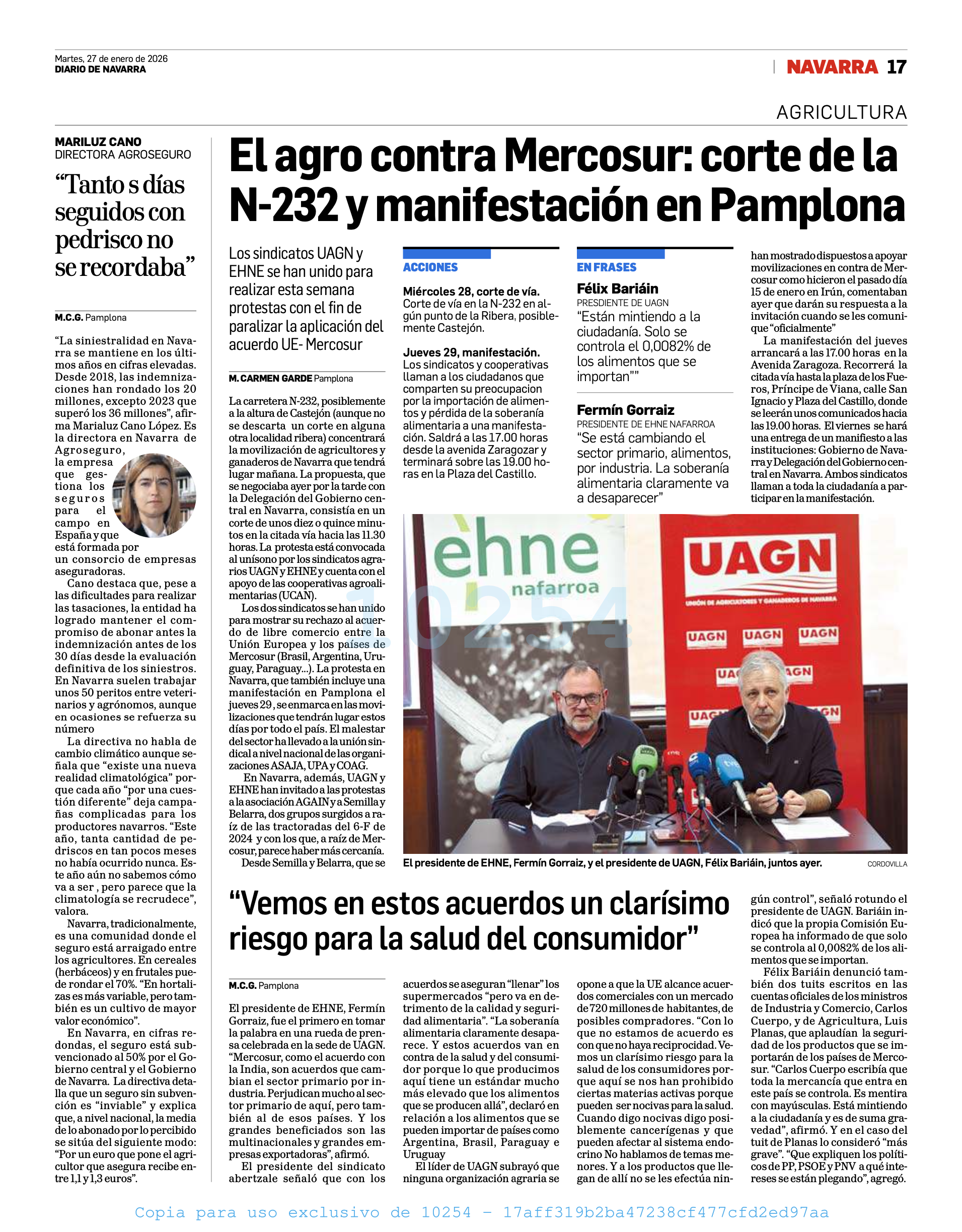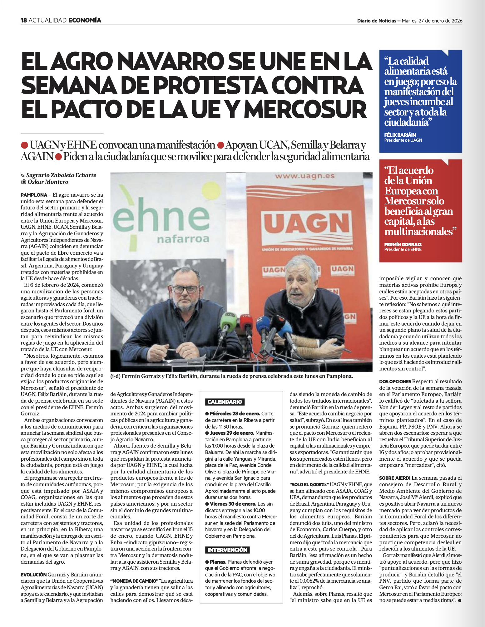 - Europa Press: ‘UAGN y EHNE convocan una manifestación en Pamplona y un corte de carretera en Castejón contra el acuerdo de Mercosur’