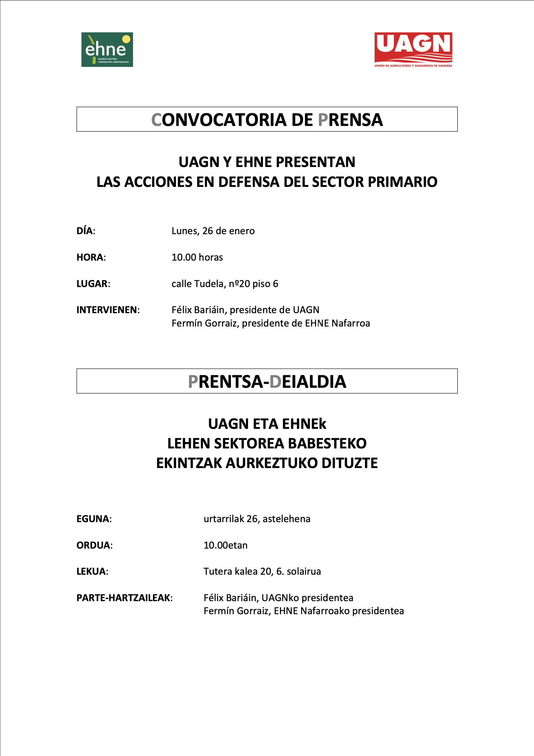 - UAGN y EHNE Nafarroa: convocatoria de prensa