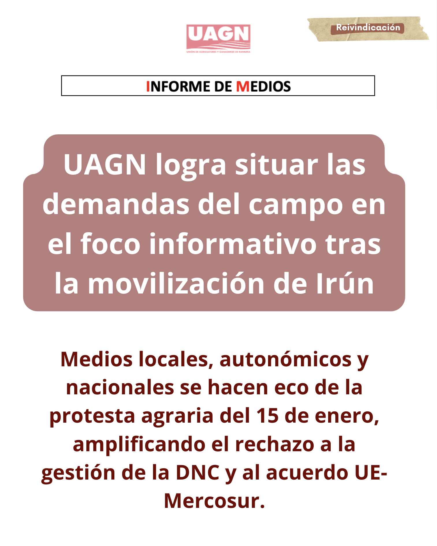 Desde UAGN se valora muy positivamente esta repercusión mediática, que refuerza la estrategia de la organización de combinar movilización en la calle y presión institucional, y demuestra que la acción colectiva del sector es clave para influir en decisiones políticas que afectan directamente a la actividad agraria y a la seguridad alimentaria.
