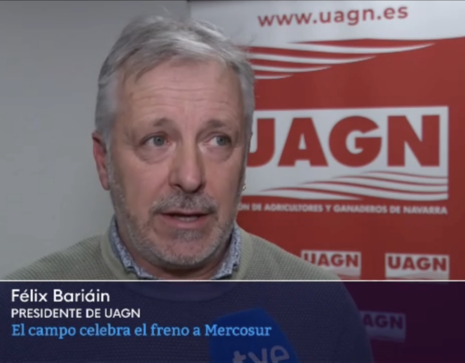 Félix Bariáin, presidente de la organización agraria, expresa, ante las cámaras de Navarra Televisión, que las declaraciones del portavoz del Gobierno de Navarra, Javier Remírez, sobre el acuerdo UE–Mercosur resultan inaceptables para el sector primario y exige el rechazo de la alianza comercial.