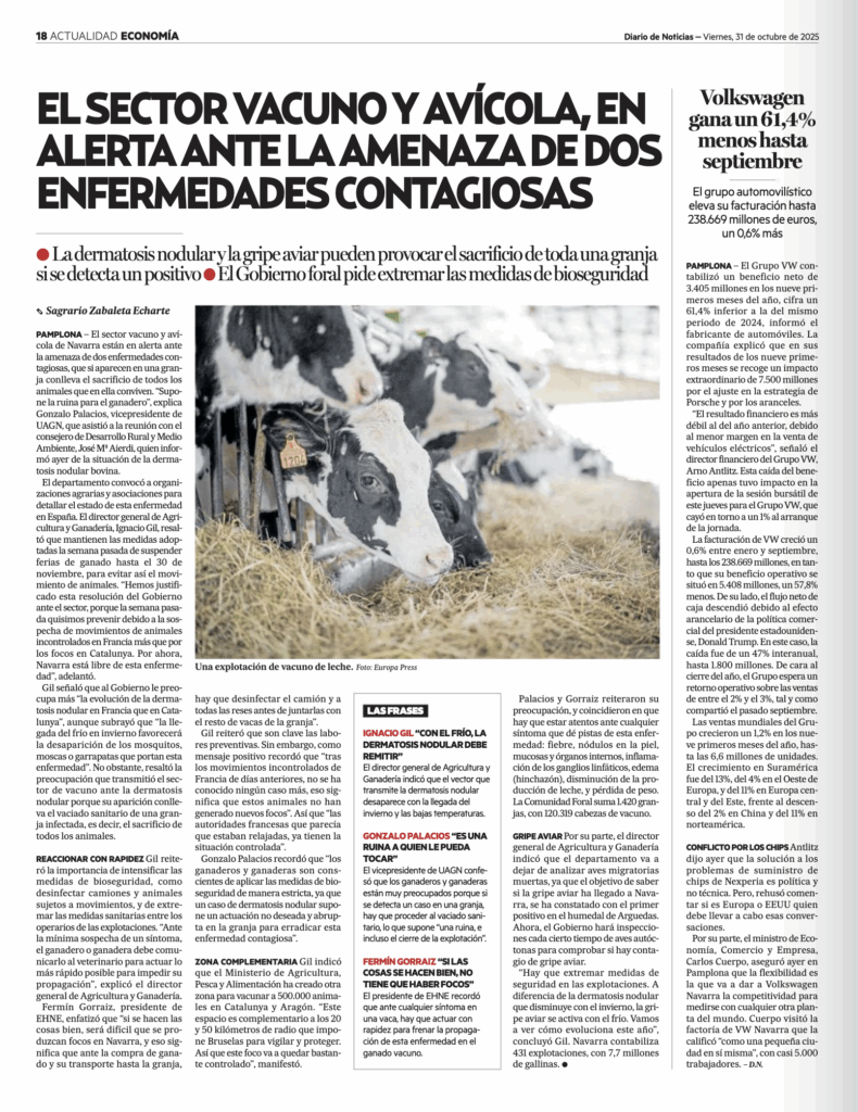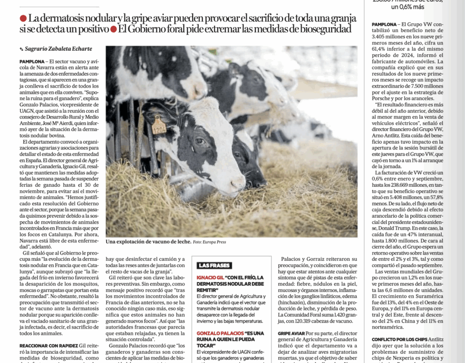 Diario de Noticias preguntaba a UAGN por la Dermatosis Nodular y la Gripe Aviar. Gonzalo Palacios, vicepresidente del a organización, respondía.
