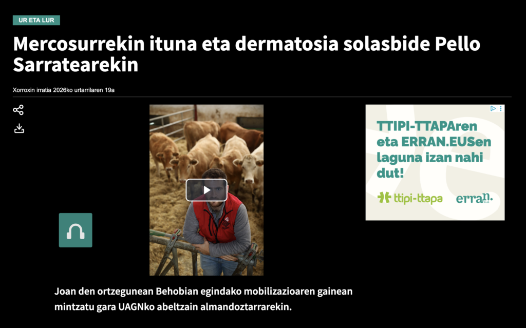 Este 15 de enero, la organización agraria llenaba un autobús a Irún, donde junto a ENBA y EHNE Confederación, el sector denunciaba la gestión de la DNC y la falta de reciprocidad en los acuerdos comerciales europeos. A continuación, la lista de medios de comunicación que se han hecho eco […]