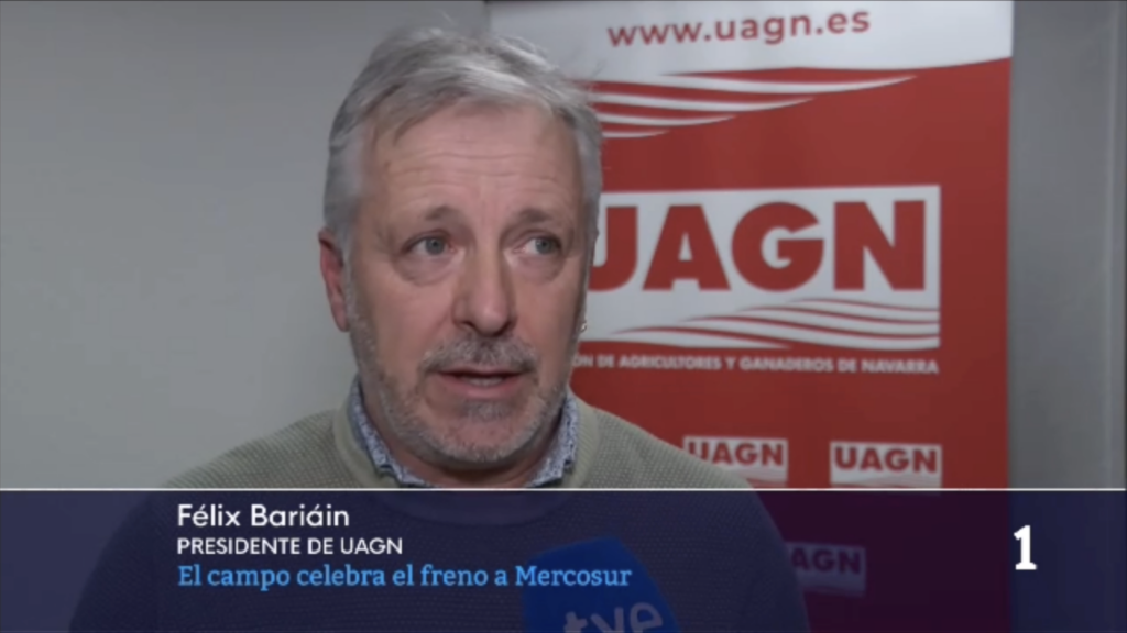 Félix Bariáin, presidente de la organización agraria, expresa, ante las cámaras de Navarra Televisión, que las declaraciones del portavoz del Gobierno de Navarra, Javier Remírez, sobre el acuerdo UE–Mercosur resultan inaceptables para el sector primario y exige el rechazo de la alianza comercial.